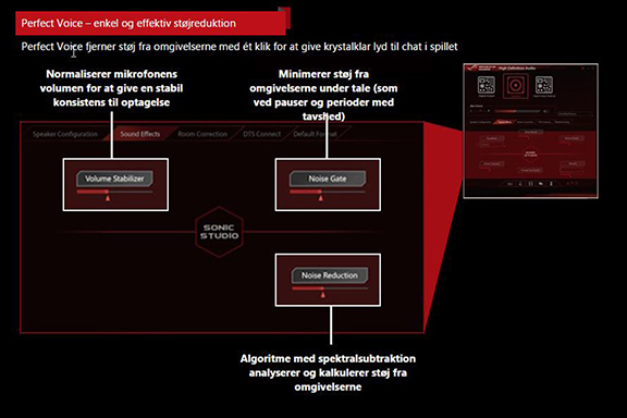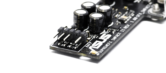 Her ser I SupremeFX indstikskortet, og under hjelmen gemmer der sig, ligesom der efterhånden altid gør, en Realtek ALC1150 lydchip, der kan levere op til 115 dB(A) og en 600 ohms SenseAmp headphone amplifier. På fronten af indstikskortet finder vi headeren til fronten af kabinettet.