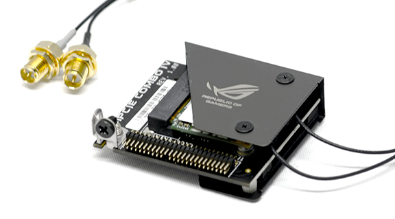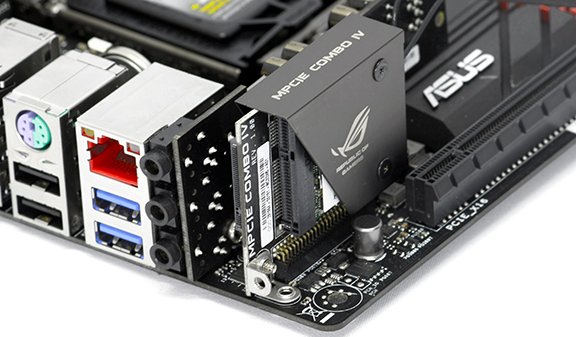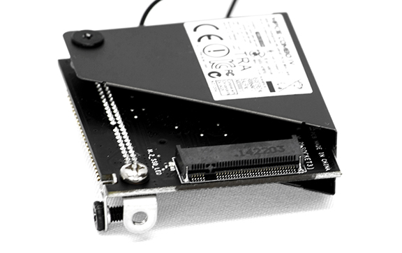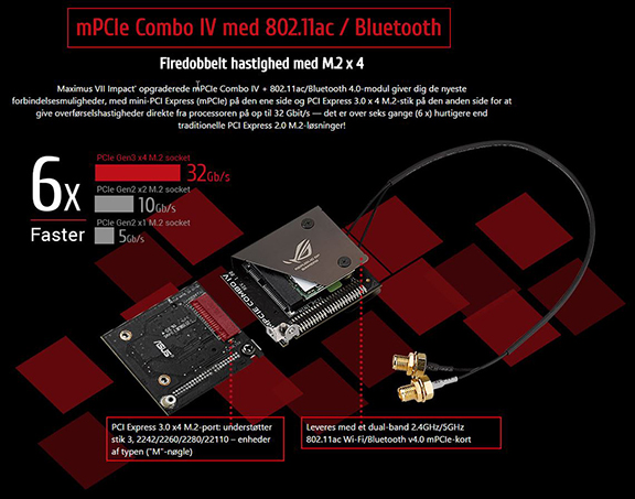 Med et enkelt indstikskort, det såkaldte mPCIe Combo IV, får vi både 802.11ac Wi-Fi, Bluetooth og PCIe Gen.3 x4 M.2 Socket med op til 32 Gbps. Altså, kommer vi ikke til at mangle tilslutninger, selvom det er meget kort med sparsom plads.