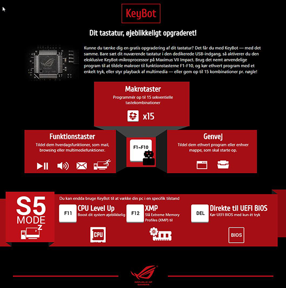 Med hjælp fra bundkortet onboard KeyBot chip har vi mulighed for at lave vores helt egen keymapping af et hvilket som helst tastatur, da det er muligt at downloade KeyBot software, der kan lave forskellige profiler. Vi kan foreksempel tildele hver enkelt tast makrofunktioner, og det er sågar muligt at få systemet til at boote i forskellige tilstande.