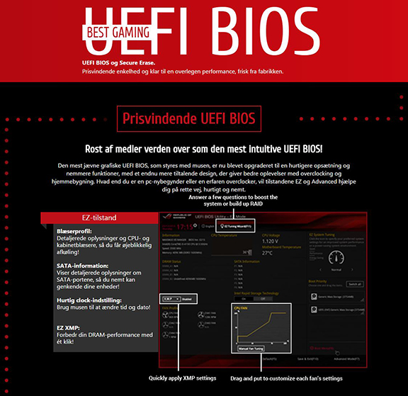 ASUS\' egen ultra brugervenlige UEFI BIOS finder vi selvfølgelig også, og det er ufatteligt nemt både at manøvrere rundt i, og det er ligeså dejligt overskueligt.