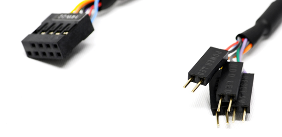 Frontpanel headeren er udført noget anderledes i denne omgang. Vi skal tilslutte et stik, som vi normalt ser det til onboard USB, til en header på bundkortet, hvorefter vi får alle stikkene hængende, som I kan se det her på billedet.