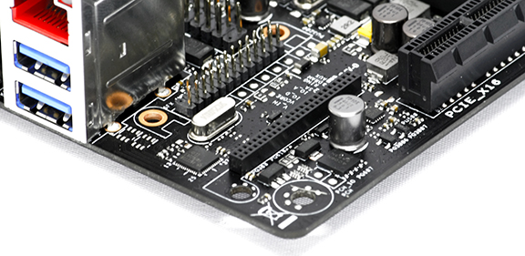 I det modsatte hjørne finder vi mPCIe tilslutningen samt tilslutningen til SupremeFX kortet, og her kommer begge kort til at stå ret op i luften, hvilket sparer utrolig meget plads.