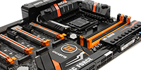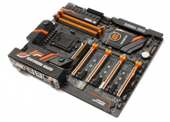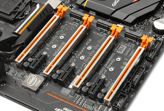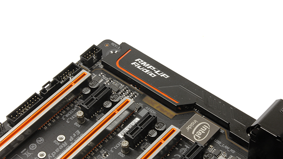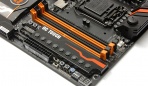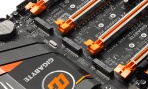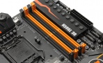 DIMM soklerne byder på mulighed for op til 64 GB non-ECC unbuffered DDR4 RAM. Der køres som altid Dual Channel Mode. Under AMP UP! Audio EMI coveret finder vi som altid den velkendte Realtek ALC1150 lydchip. Gigabyte har monteret en Intel GbE LAN chip under en EMI kapsel. Under Turbo B-Clock kapslen gemmer der sig en chip, som giver os mulighed for at justere BCLK frekvensen 1 MHz af gangen for at give den bedst mulige OC oplevelse. Det giver mulighed for at tweake OC resultatet det ekstra.