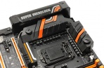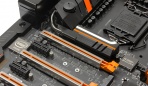 Vi bliver præsenteret for ekstra store og ekstra fede heatsinks, hvoraf VRM heatsinken endda giver os mulighed for hybridkøling. Vi har nemlig to gevind, som passer fint med G1/4" fittings, så vi kan køre med vandkøling herpå. Strømstyringen gemmer på intet mindre end 22 faser, hvilket er noget mere, end vi er vant til at se.