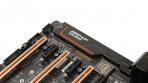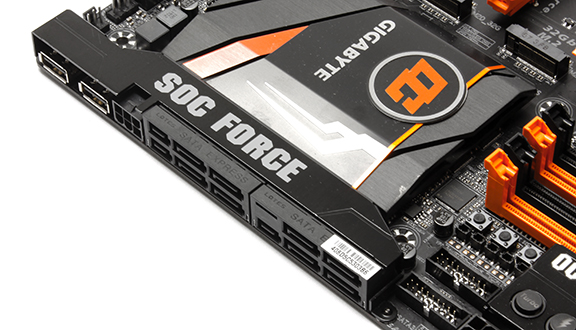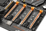 Vi finder hele otte SATA3 porte, hvoraf de seks af dem kan anvendes til tre SATA Express porte. Her finder vi også to interne USB3.0 porte, ligesom der er blevet plads til et 6-pins PCIe stik, som kan levere ekstra strøm til et krævende setup. Endvidere har vi tre Ultra M.2 porte, der hver kan levere op til 32 Gbps. Slutteligt har vi et OC panel, der kan bruges til OC on-the-fly styring. Her findes vi også ting som Reset swith, debugging LED samt BIOS switch.