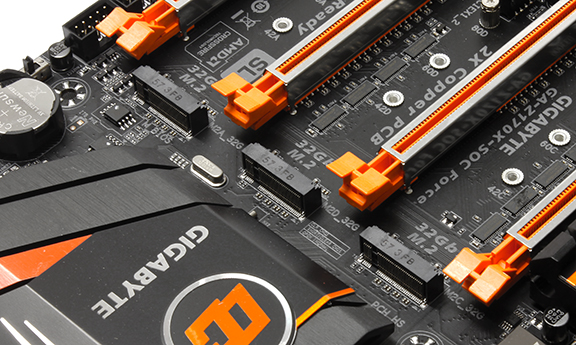 SOC Force byder endvidere på op til 4-vejs grafikløsninger. De to øverst PCIe porte kører i Gen. 3 x16 mode, mens de resterende to kører i Gen. 3 x8 mode. Dermed kan vi både få 4-vejs SLI eller CrossFireX. Dog skal det nævnes, at de to nederste porte deler PCI baner med de nederste M.2 sokler, hvorfor disse vil være deaktiveres ved 4-vejs grafik.