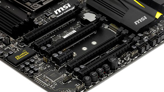 Først har vi PCIe portene, og X99S MPower er udstyret med hele fire PCIe Gen. 3 x16 porte, så vi har mulighed for 4-vejs SLI- eller CrossFireX grafikopsætninger. Desværre har bundkortet ikke PLX chips, så vi kunne køre x16 på alle kort.