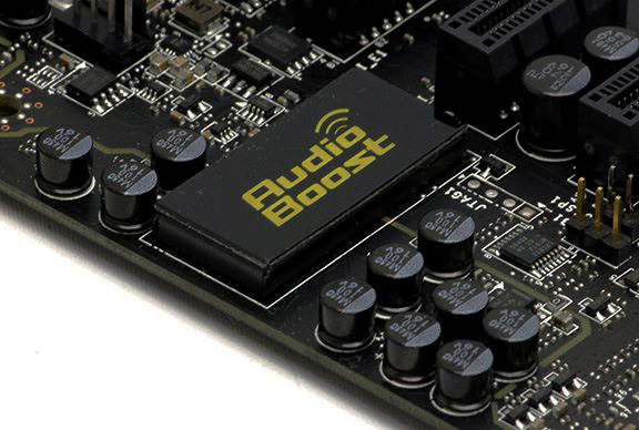 Bundkortet er også udstyret med Audio Boost lydsystemet, der består af en ALC1150 lydchip, som er toppen af poppen fra Realtek. Systemet kan klare 115 dB, mens det er udstyret med en separat headphone DAC, der kan klare headsets op til 600 ohm. Systemet er selvfølgelig indkapslet i en EMI-kapsel, ligesom det er isoleret på sin egen del af PCB'et for at sikre minimal elektronisk interferens fra andre onboard komponenter.