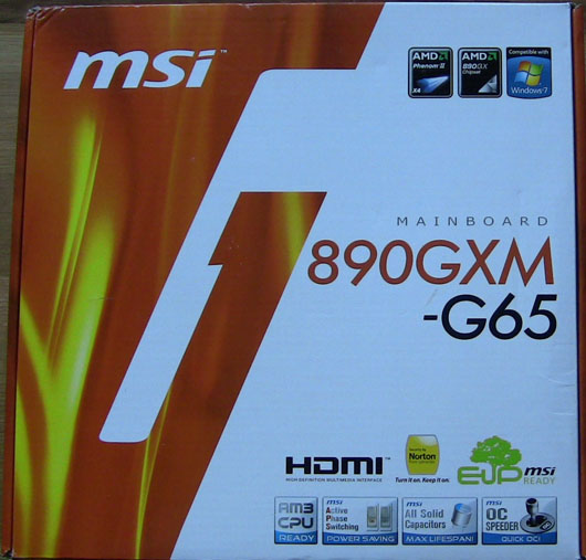 MSI 890GXM-G65 er pakket i en orange-hvid kasse med påtrykt model nummeret anført ude i højre side hvor af, der i bunden er anført hvilke features dette kort besidder.