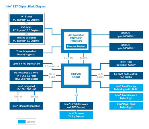 Hvad angår det grafiske, kan du smide to grafikkort til. De får hver især 8 lanes at lege på, og versionen hedder 3.0. PCIe 3.0 kan flytte 4x så meget data frem og tilbage ift. PCIe 1.0. Hukommelsen der understøttes er enten DDR3 eller DDR3L, hvor sidstnævnte står for low-voltage, altså moduler med et lavt strømforbrug. De første 16 PCIe lanes samt hukommelsen administreres direkte fra CPUen, og resten, herunder USB og SATA, tager chipsættet sig af. Udover de mange USB porte, så tilbyder Z87 hele 8 PCIe 3.0 lanes, samt et Gigabit netkort.