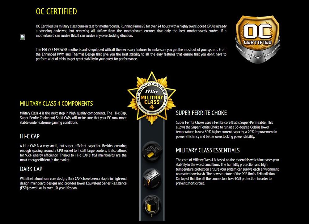 MSI har udstyret bundkortet med Military Class 4 komponenter, der er testet til at kunne klare ekstreme forhold. Som følge heraf, er bundkortet ”OC Certificeret”, som betyder, at MSi har udsat bundkortet for ekstreme prøvelser, her bl.a. tests hvor alt køling fjernes, og komponenter får lov at svede. Kun de bedste bundkort overlever, som MSI selv udtrykker det. Derudover så er komponenterne udført i en rigtig god kvalitet, de kan bl.a. tåle meget høje temperaturer samt yder godt under pres, og så er levetiden meget bedre end for gennemsnittet.