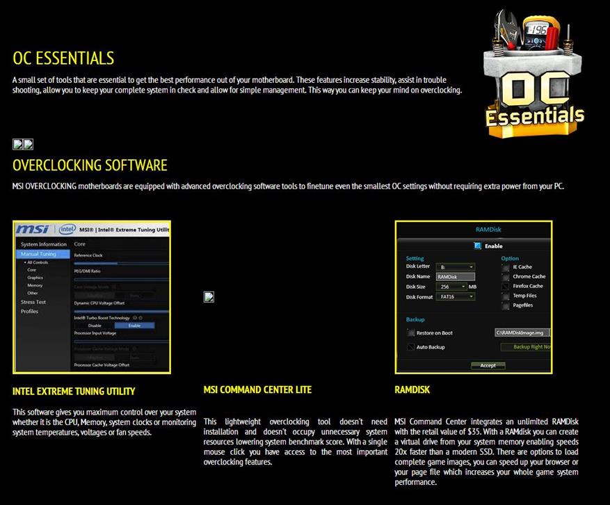 MSI har været rigtig søde ved dig, der har lyst til overclocke lidt. De har nemlig smidt en omgang software med, der gør det muligt at overclocke inde fra Windows, oprette en RAM disk, samt få et overblik over hele systemet.