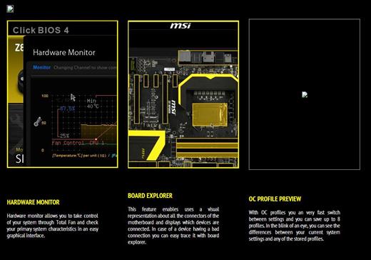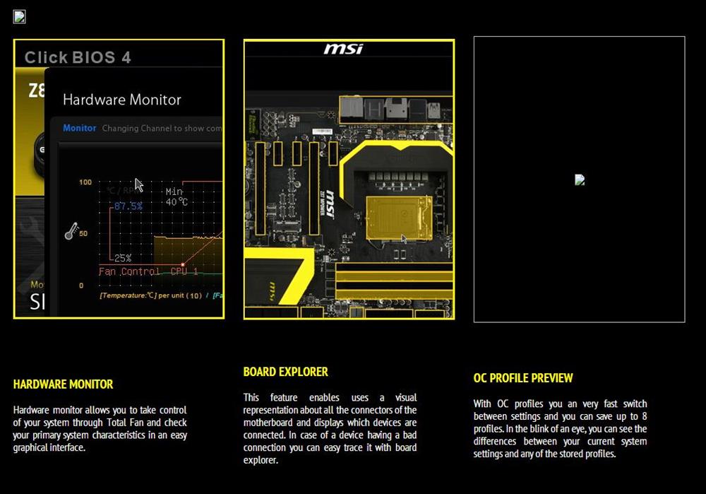 Derudover så er der I BIOS indbygget en monitor, der meget detaljeret fortæller om systemets status, herunder temperaturer, clockhastigheder samt blæserhastiger. Der er også en såkaldt ”Board Explorer”, der lader dig undersøge bundkortet, så du kan få et overblik over hvad der er hvad, og hvor hvad sidder. Slutteligt, kan du drage fordel af MSi OC Profile feature, der let og hurtigt lader dig skifte mellem op til 8 profiler. Smart og innovativt!