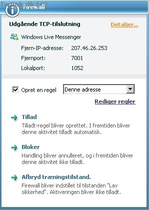 Den medfølgende Firewall er også en smule paranoid i starten, hvilket også hænger sammen med brugen af ”Interaktiv beskyttelse” som ofte popper op og spørger om de forskellige ting må få adgang til registreringsdatabasen eller udgående kommunikation som det ses på nedenstående billede