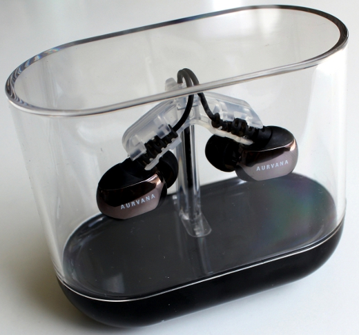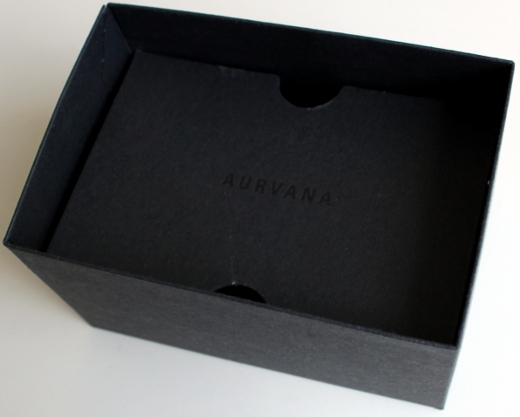 Får man åbnet kassen finder vi endnu en "kasse". Der er nemlig en lille plastik beholder inde i indpakningen hvor Aurvana befinder sig. Man får med det samme følelsen af at man sidder med noget eksklusivt i hænderne.