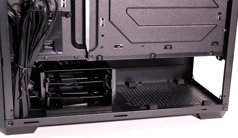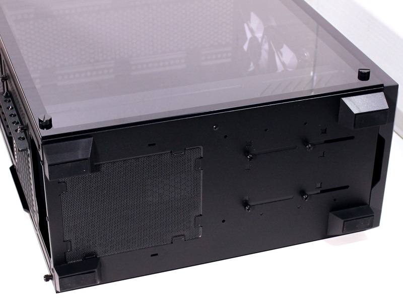 Bunden består af fire plastikfødder, som alle har gummi monteret for at minimere vibrationer i at blive sendt videre. Det er også hernede du kan løsne fire skruer, såfremt du ikke har behov for harddiskburet til de to 3.5” diske, som vi kigger på senere. Støvfilteret er modsat de to andre i fronten og toppen, af den utrolig billige og ret kedelige kvalitet, som både er svær at rengøre, men endnu sværere at montere igen efter rengøring. Men man kan jo ikke få det hele gratis, og prisen på P8 er jo lav, og derfor har vi prisen i tanke.
