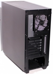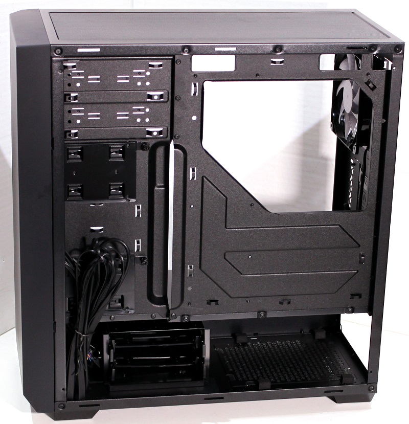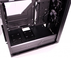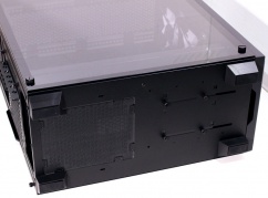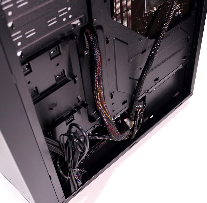 Lad os vende kabinettet 180 grader og tage et kig på den modsatte side. Det første der springer i øjnene er det store hul til udskiftning af CPU-køler. Dette er smart, da man på den måde slipper for at skulle have bundkortet ud. Der er også en god portion steder hvor strips (kabler) kan fastgøres, hvilket er lækkert at se. Oven over bundkortet er der tre huller til kabler, mens der ned langs siden er et langt, gemt lidt væk bag et cover.