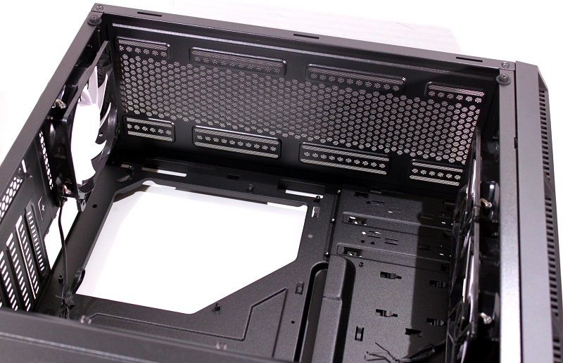 I bunden finder vi et cover foran strømforsyningen, hvilket kun var ting der var at finde i dyrere kabinetter for ikke så lang tid siden. Nu er det efterhånden også ved at være en fast del i budgetkabinetterne, hvilket er lækkert. På dette cover finder vi de to første SSD pladser, så du kan fremvise dit lynhurtige lager. Stik modsat i toppen, finder vi en masse ventilation, faktisk ikke andet. Som vi kan se, har Antec udstyret P8 med nogle riller i stedet for blot huller til skruer. Dette er et stort plus, da man på den måde selv kan justere hvor langt frem/tilbage blæserne eller radiatoren skal være.