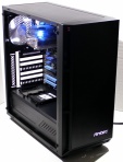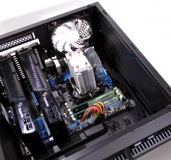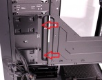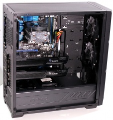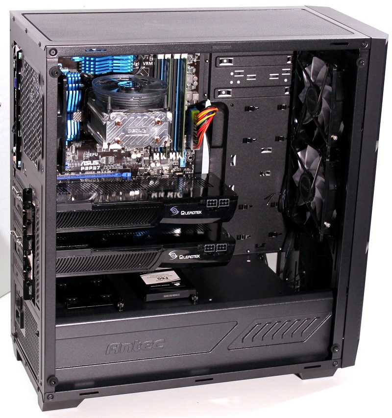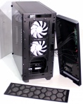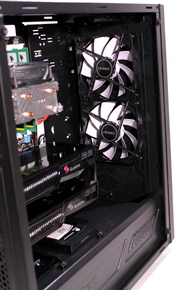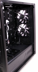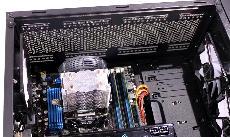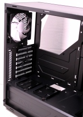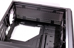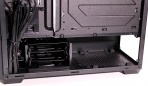 Som nævnt er der fri passage for luften fra fronten, henover grafikkort og bundkort. Dette kan tydeligt ses på det første billede herunder. Det er tydeligt at se, at Antec har tænkt at radiatoren skal monteres i fronten, da der også er et hul i coveret til strømforsyningen, således at store 360 mm radiatorer også kan være der.