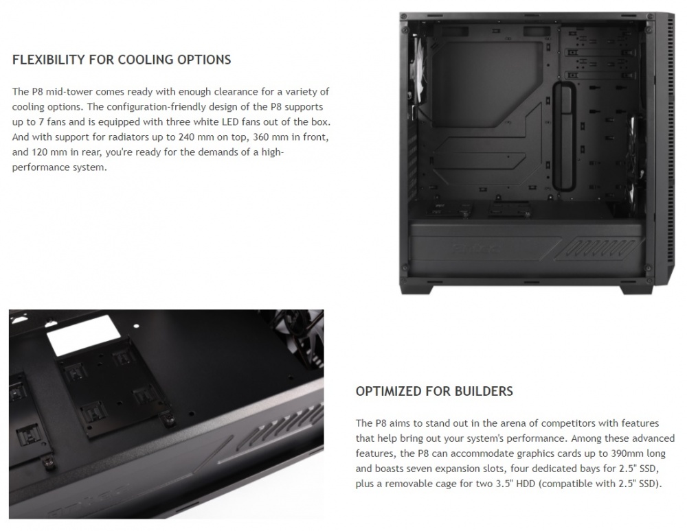 Jeg har været en tur forbi producentens hjemmeside, eller skulle man sige webshop. Er jeg den eneste der syntes at deres normale hjemmeside virker lidt gammeldags? Nedenfor finder du specifikationerne på P8 PC kabinettet listet op, efterfulgt af et par billeder der viser et par af de features som kabinettet kommer med: