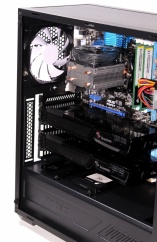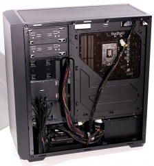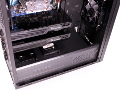 Installationen af hardwaren foregik ganske smertefrit. Det åbne design på både for og bagside, gjorde det yderst let og ligetil at få både bundkort og strømforsyning i kabinettet. Vælger du at montere dine SSD’er på bagsiden, skal du dog være opmærksom på at pladsen er lidt trang, da det store 24-pin ATX kabel æder godt med plads omkring disse to beslag.