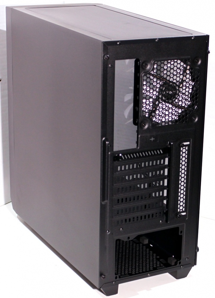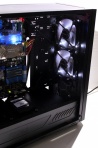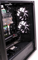 Forrest finder vi de to 120 mm LED blæsere monteret i toppen. Der er faktisk plads til endnu en i bunden. Der er fri passage fra fronten og henover bundkort og grafikkort, hvilket sikrer bedst muligt airflow til de varmeste komponenter i computeren. De førnævnte PCI-slots er naturligvis at finde i bagenden, sammen med den tredje og sidste 120 mm LED blæser. Som nævnt er disse PCI-covers ikke genbrugelige, da de skal brækkes ud af kabinettet.