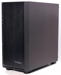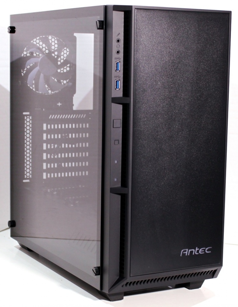Lad os kaste det første blik på computer kabinettet herunder. Hele venstre side består af ét stort stykke hærdet glas, som monteres med fire tommelskruer, præcis som stort set alle andre kabinetter med denne feature. Fronten er en blanding af metal og plastik med et Antec logo nederst i højre hjørne. Ligeså spændende som den venstre side er, lige så kedelig er den højre. Her er der ikke andet end en blank sort flade.