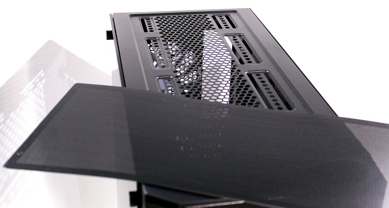 I toppen finder vi et stort magnetisk støvfilter, som dækker mere eller mindre det hele. Her er der god support for både vandkøling og blæsere. Du kan montere op til en 240 mm radiator her, så længe du er OBS på at der er plads nok i forhold til dine RAM og køleprofiler på bundkortet. Er du mere til luftkøling, er der support for op til tre 120 mm blæsere her oppe også. Støvfilteret er af den bløde type som let kan tages af og rengøres.
