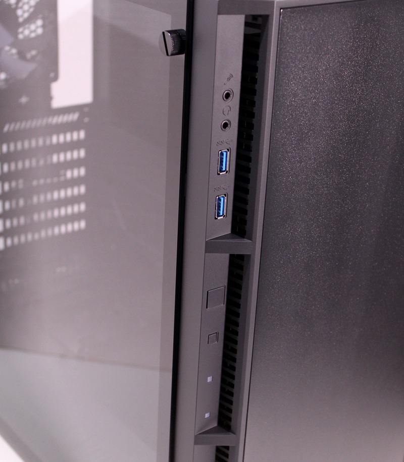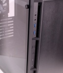 Frontpanelets I/0, finder vi for en gangs skyld på selve fronten. Mange kabinetter flytter disse porte op på toppen nu til dags. Langs den venstre side på fronten, finder vi øverst lyd ind/ud, efterfulgt af to USB 3.0 porte. Nederst er der både power og reset knap, samt dioder for power og harddisk aktivitet. Fronten kan desuden afmonteres ved at tage fat i bunden og give et ryk, vær dog opmærksom på at alle kablerne fra frontpanelet er fastgjort til selve fronten!