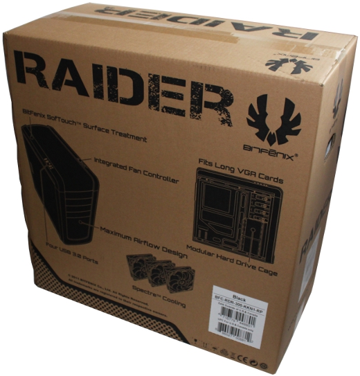 Som alle andre BitFenix kabinetter vi har testet her på Tweak.dk kommer Raider også i en meget anonym papkasse. På fronten finder vi BitFenix logo samt navnet Raider. Lige ledes er navnet Raider også at finde på toppen.