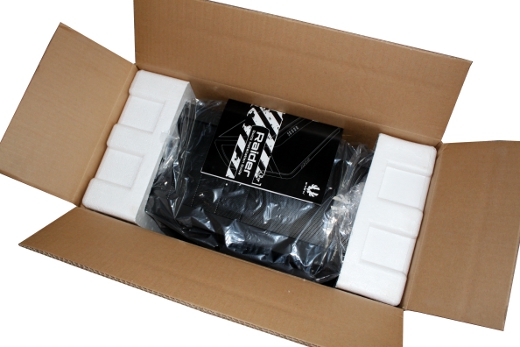 Åbner vi kassen finder vi Raider kabinettet pakken ind i en plastikpose og sikret med flamingo på begge sider. Øverst oppe er manualen/intall guiden lagt i.