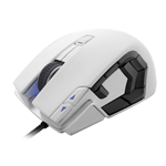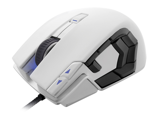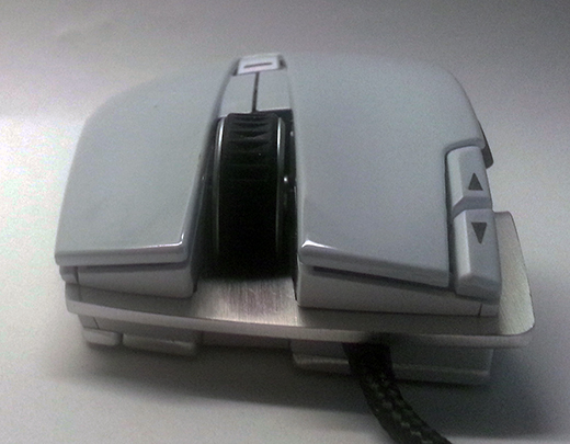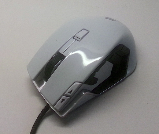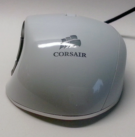 På denne mus, er Unibody designet faktisk næsten helt gemt væk. Og det er synd og skam, da sådan et design kan se hamrende godt ud. Men Corsair har i stedet valgt at smide en masse hvid plastik over, som virker i rigtigt fornuftig kvalitet. Dertil kan du se 3 af dens knapper, ud over de almindelige. De to ved venstre musetast er forprogrammeret til at skifte DPI’en op og ned, og den sidste, oppe på midten af musen, er ikke forprogrammeret til noget. Sidst kan du selvfølgelig også se de 2 almindelige højre- og venstretaster, samt scrollhjulet. Scrollhjulet er også lavet i ét stykke aluminium, og er derfor rigtigt lækkert, og vægten er god.