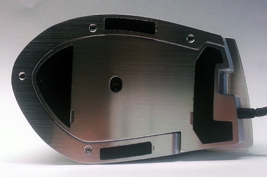 Sidst, men ikke mindst, er der her et billede af musens bund. Og det er her du får mest at se af Unibody designet. Ud over dette er der ikke andet at berette om, end de 4 PTFE glide pads, som sikre en god og nemt glidende bevægelse, når du flytter musen, og så selvfølgelig hullet til Avago sensoren.