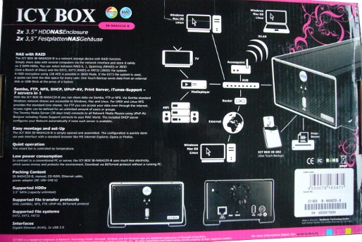 Vender vi kassen rundt får vi enheden at se både forfra og bagfra. Raidsonic har tegnet et diagram på kassen som forklarer hvor alsidig IcyBoxen er, den fungerer sammen med alt andet udstyr man kunne tænke sig, og den understøtter både Windows, Linux og OSX, derudover er det muligt at tilgå den uden for sit hjemmenetværk hvis man har sat sin router rigtigt op, og så kan den agere som printerserver, hvis man vil dele sin USB printer med andre computere på sit hjemmenetværk.