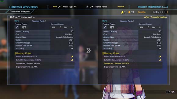Du kan også få opgraderet dine items, eller lægge stats fra et våben til et andet, ved at gå til Lisbeth. Lisbeth kan modificere dine våben til det du gerne vil have, så længe du har materialerne til det eller andre stats fra andre våben, som du kan bruge. Der er mange stats at vælge imellem, så det gælder om at have flere våben til forskellige fjender og forskellige encounters.