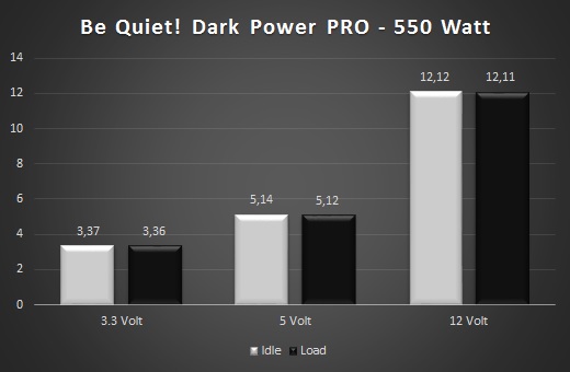 Efter at have stresset strømforsyningen og ladet den stå i idle, aflæste vi vores spændingsværdier, som så således ud.