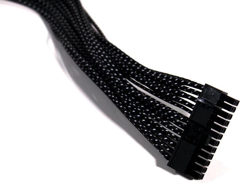 Vi starter ud med det store 24-pin kabel som sørger for strømmen til bundkortet. Her har jeg også zoomet ind på kablet i den ene ende, for rigtig at vise sleevingen på kablet. De er betrukket helt ind i stikkene, hvilket betyder at der ikke er nogle løse ender, eller noget synligt at kablerne. Jeg har selv kabler fra CableMod i min computer, og vil sige at kvaliteten på Enermax kablerne matcher – det er rigtig flotte!