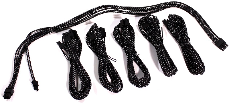 Som i en hver anden strømforsynings test, starter vi igen ud med at kigge på de modulære kabler. Normalt plejer jeg at rose producenter for blot at gøre alle kablerne sorte, men Enermax har taget dette et skridt videre og løftet baren for hvad man kan forvente af highend strømforsyninger. Inkludereret til MaxTytan 800 watt finder vi nemlig hvad vi normalt vil kalde custom sleevede kabler. Det betyder at alle kablerne er betrukket individuelt, hvilket giver et mere eksklusivt look. Farverne er holdt neutrale i sort/hvid, hvilket betyder at de vil passe ind i et hvert build. Lad os gennemgå de forskellige kabler man får med, efter overbliksbilledet herunder.