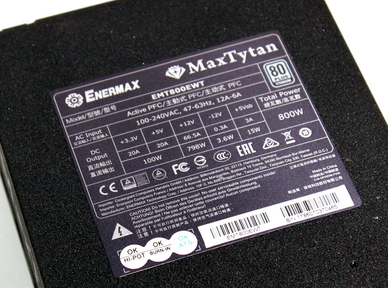 På bunden, eller toppen – alt efter hvordan man vender strømforsyningen. Finder vi et stort klistermærke med en oversigt over outputtet på strømforsyningen, samt serienummer og lidt andre oplysninger. Ud af den samlede kapacitet på 800 watt, er 798 af dem tilgængelig på 12V linjen, sammen med hele 66.5 ampere, not bad.