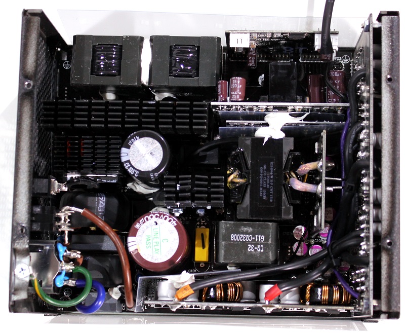 Med masser af kvalitets komponenter, er det heller ikke nødvendigt med en masse afskærmninger inde i strømforsyningen imellem de forskellige kredsløb. Ikke engang strømstikket er afskærmet, hvilket vi ellers ser ret ofte. Nyd det sidste overbliksbillede af MaxTytan 800 watt indvendigt, inden vi igen samler den og tilslutter den vores belaster. Det er med andre ord blevet tid til test delen!