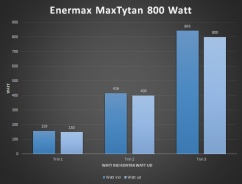 Lad mig sidde lidt ord på graferne ovenover samt mine observationer under belastningstesten af MaxTytan 800 Watt strømforsyningen. Hvis vi starter ud med spændingsværdierne er der her absolut ikke noget negativt at sige. De holder sig alle et godt stykke inden for hvad der er respektabelt. Effektiviteten var intet mindre end eminent lige meget hvor meget jeg belastede strømforsyningen. Under fuld belastning på 800 watt, trak strømforsyningen kun 843 watt ud af væggen, hvilket er et minimalt spild og giver MaxTytan 800 Watt en effektivitet på hele 95% under fuld belastning – en procent over hvad kravene er, imponerende!