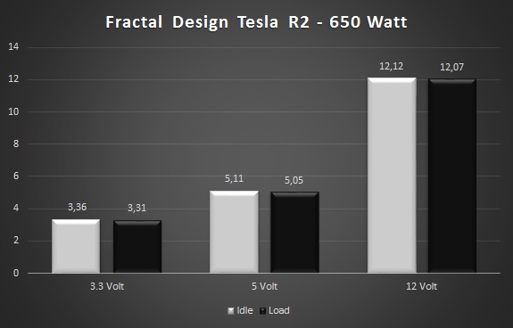 Efter at have stresset strømforsyningen og ladet den stå i idle, aflæste vi vores spændingsværdier, som så således ud.