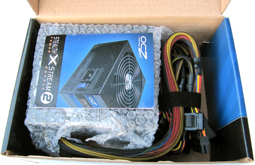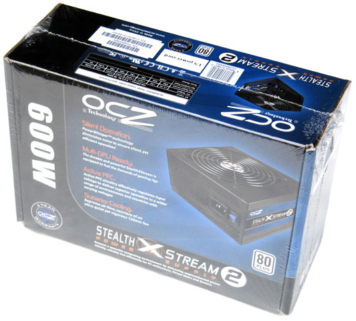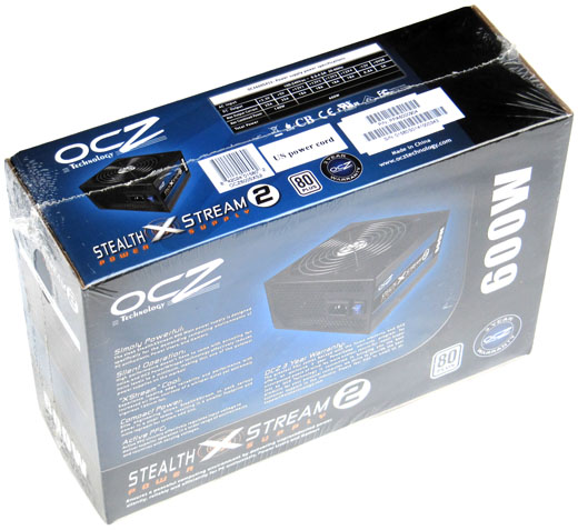 Stealth X Stream 2 600W kommer i en mørkeblå/sort informativ indpakning. På fronten har OCZ valgt at illustrere et billede af strømforsyningen og opliste features. Stealth X Stream 2 600W er dækket af 3 års garanti, har en kapacitet på 600 watt, og er energimæssigt 80+ certificeret.