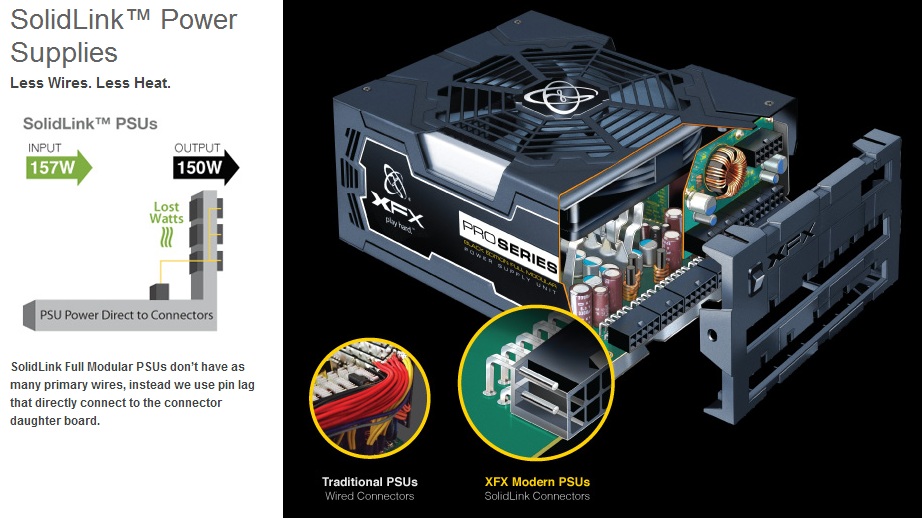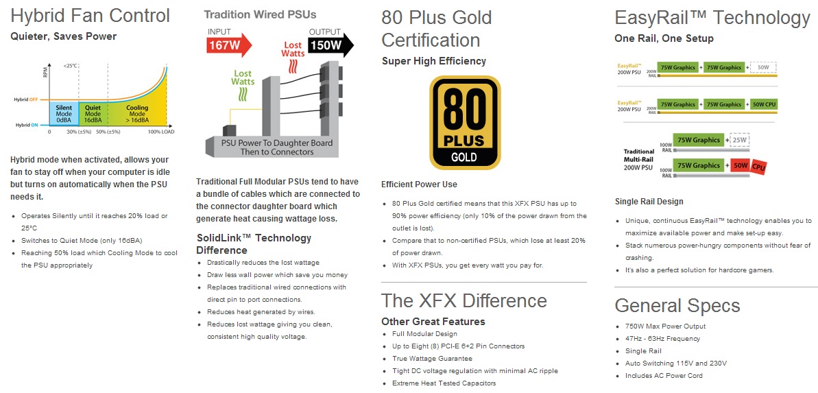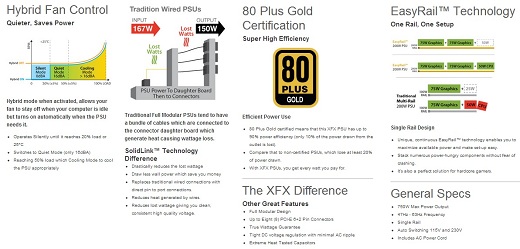 Inden vi springer ud i det og tager et kig på kablerne der medfølger, tager vi lige to billeder lånt fra XFX´s hjemmeside, der også beskriver lidt features omkring strømforsyningen.